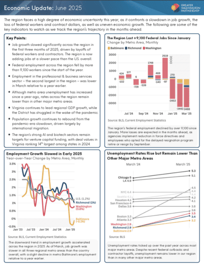 The region faces a high degree of economic uncertainty this year, as it confronts a slowdown in job growth, the loss of federal workers and contract dollars, as well as uneven economic growth. Explore our regional snapshot to understand some of the key indicators to watch as we track the region’s trajectory in the months ahead.