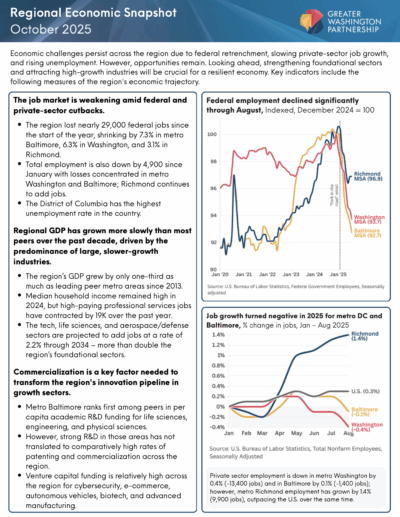 Economic challenges persist across the region due to federal retrenchment, slowing private-sector job growth, and rising unemployment. However, opportunities remain. Looking ahead, strengthening foundational sectors and attracting high-growth industries will be crucial for a resilient economy. Key indicators include the following measures of the region's economic trajectory.